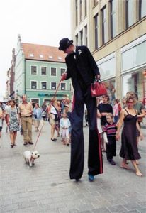 Weltoffen schreitet der Gentlemen durch die Straßen, in Parkanlagen oder in hohen Räumen umher und kommuniziert mit den Menschen über Gott und die Welt. Manchmal borgt er sich Hunde zum Gassi gehen aus und agiert interaktiv mit dem Publikum z.B. beim Tee trinken den er natürlich dabei hat.