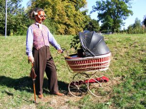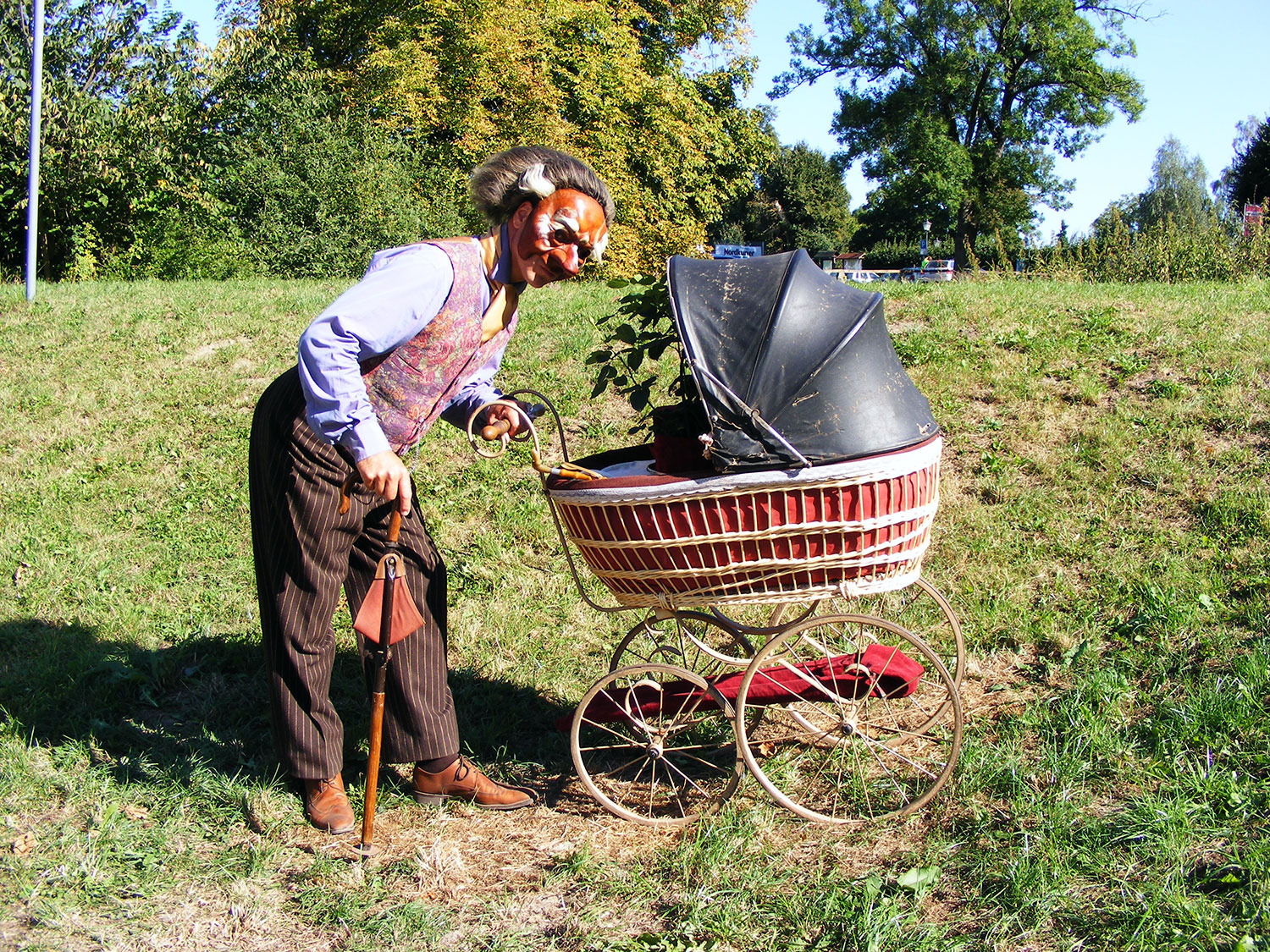 Charmant und aufgeschlossen wandelt der alte Junggeselle und Rosenliebhaber mit seinem Kinderwagen – darin, wie kann es anders sein, ein Röschen im Sektkübel – durch ihr Ambiente auf der Suche nach der Baroness seines Lebens.